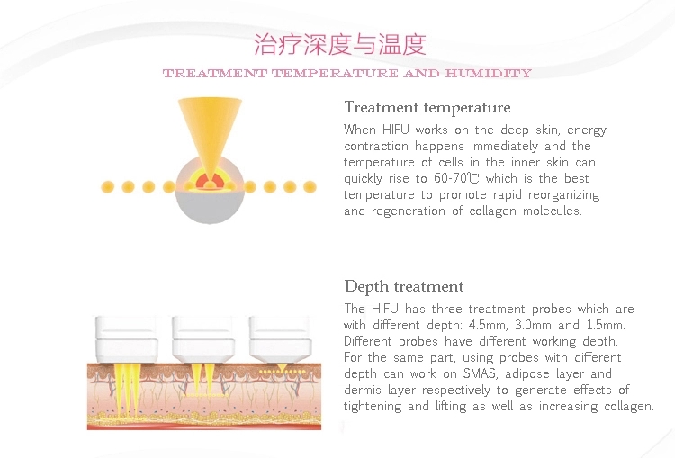 When HIFU works on the deep skin, energy contraction happens immediately and the temperature of cells in the inner skin can quickly rise to 60-70℃ which is the best temperature to promote rapid reorganizing and regeneration of collagen molecules;